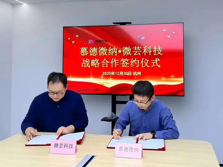 2025年12月30日下午,慕德微纳与微芸科技举行战略合作签约仪式,双方将携手深耕倾斜光栅刻蚀领域,联合开发高性能反应离子束刻蚀设备,推动 AR 刻蚀光波导技术产业化升级。