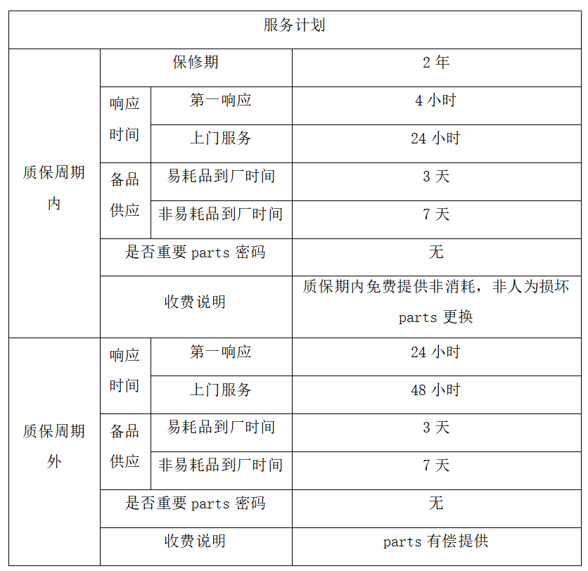 微芸刻蚀机采用模块化设计,功能划分清楚,结合故障报警,能够迅速发现并解决问题,有效控制维修时间,提高机台保障性。设备的核心模块包括:工艺系统、传动系统、真空系统。机台大部分功能部件可以长时间正常运行,只需要按照维修手册定期检定保养即可,其中,机器人的寿命约为10年,当机器人稳定性下降到一定程度后,需要进行维护,超过保修期后由机器人供应商提供专业的维修。我司对常用的备件有稳定的库存,便于即时更换,磨损严重需要修正的精密零部件,由经验丰富的技术人员可以快速修复,服务计划及响应时间见下表。